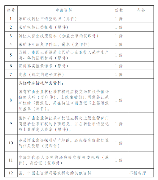1.采礦權(quán)轉(zhuǎn)讓申請(qǐng)登記書(原件)。格式規(guī)范,內(nèi)容完整,加蓋申請(qǐng)人公章,填寫礦山名稱、轉(zhuǎn)讓申請(qǐng)人、法定代表人、采礦權(quán)取得時(shí)間及方式、采礦權(quán)轉(zhuǎn)讓原因及方式、采礦許可證證號(hào)、發(fā)證機(jī)關(guān)、有效期限、采礦權(quán)評(píng)估值、采礦權(quán)轉(zhuǎn)讓底價(jià)、評(píng)估機(jī)構(gòu)名稱、評(píng)估機(jī)構(gòu)資格證號(hào)、應(yīng)繳納的采礦權(quán)使用費(fèi)、應(yīng)繳納的礦產(chǎn)資源補(bǔ)償費(fèi)、應(yīng)繳納的資源稅、應(yīng)繳納的采礦權(quán)價(jià)款、采礦權(quán)屬有無(wú)爭(zhēng)議、采礦權(quán)價(jià)款繳納方式、礦區(qū)面積。